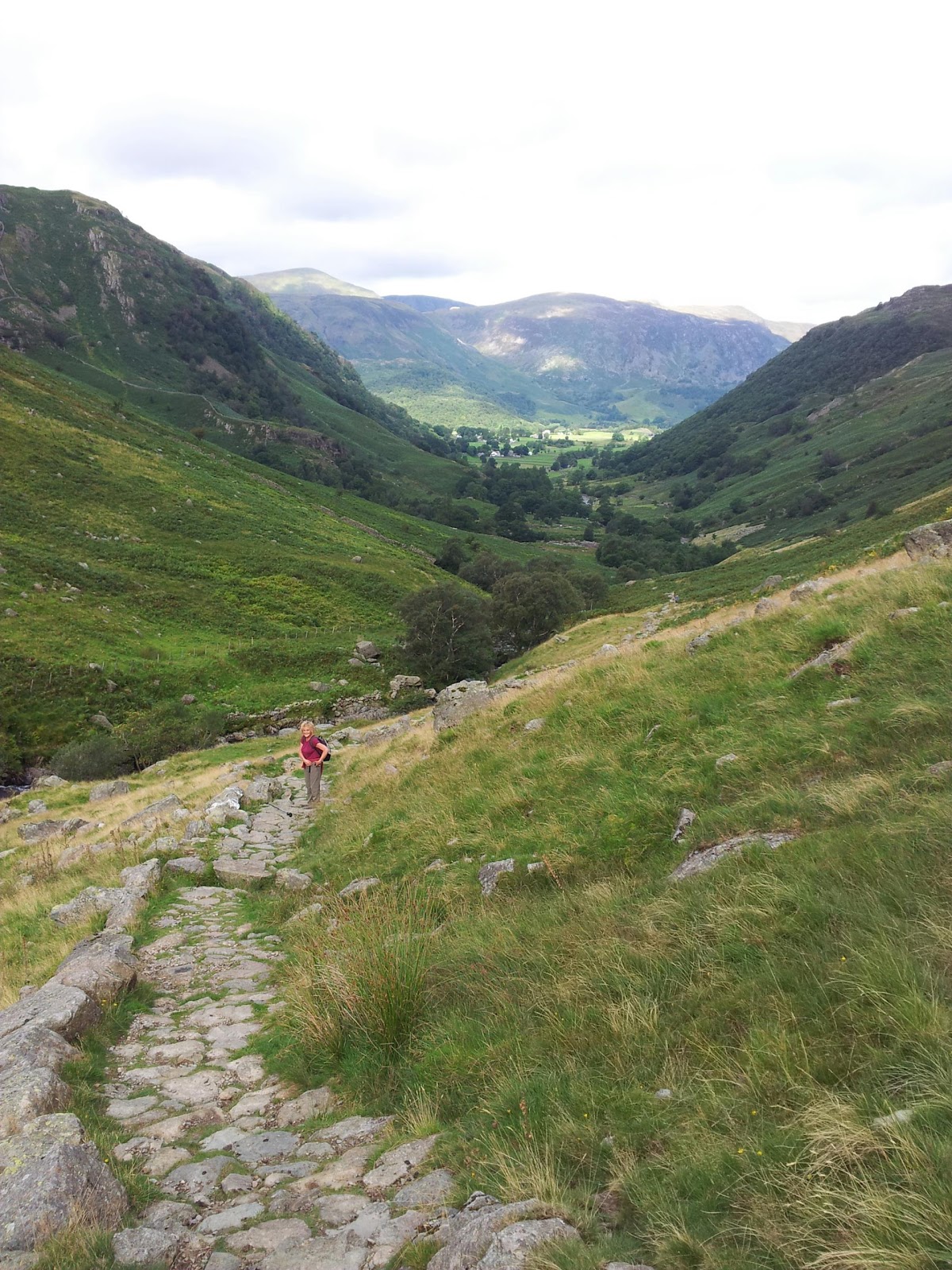 Great weather today! Neither mist nor rain but quite a lot of mud and bog. We have conclusively proved that our walking boots are waterproof. The walk up Greenup Ridge was fairly steep; a long hard slog. Am thinking Wainwright should have named it the Coast to Coast Climb. But it was more enjoyed than endured today and finishing with tea and cake in Grasmere was a treat, as we had foregone the packed lunch option. It is a shorter day than most but with a lot of up and down. Only 8 miles. Jen and I took the Easedale valley route from Greenup Edge even though the Alfred Wainwright guide seemed to imply it was the wimp's option. He didn't even provide a map for it saying that the path made navigation unnecessary. That's probably why A and P countenanced us walking on our own! We managed well despite bogs and rocks and constant fording of streams. We felt the ultimate humiliation would be the men reaching Grasmere before us as they had climbed some crags on the way. Jen and I made a slight diversion as a result of coming across a huge reddish bull in a field and deciding to climb over a gate and go another way to the path into Grasmere. We were delighted to meet Pat and Andrew on the path -they had heard us returning from the field of the aforesaid bull! It's lovely to get in earlier to the BandB and have time for a hot bath and the blog. WiFi is available too.in future silence will indicate exhaustion or lack of WiFi or both. Again a big thank you to all who support us and the GRCT in so many ways. Thank you for your giving and your prayers.